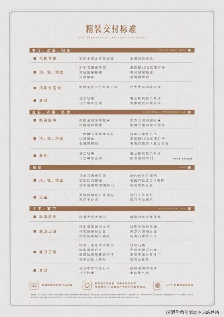 项目装修标准也是诚意满满,中央空调、地暖、新风系统“三大件”配齐,厨房、卫浴也有不少细节交付标准。