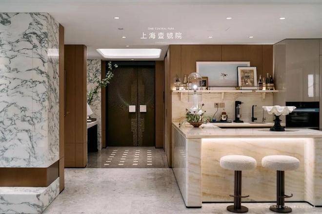 据了解,玄关地面采用土耳其进口的星灰大理石;公区地面为巴宝莉灰大理石通铺;西厨的岛台台面采用条纹白玉通铺,线条感十足;玄关墙面及背景墙,则选用进口皇家玉石,温润而典雅。(实际以开发商交付/公示为准)