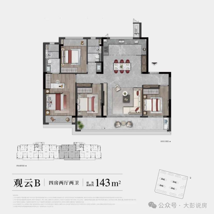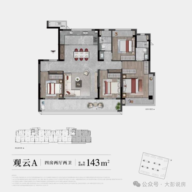 四房三套房设计,四开间朝南,约16.3米面宽,采光、视野极佳;