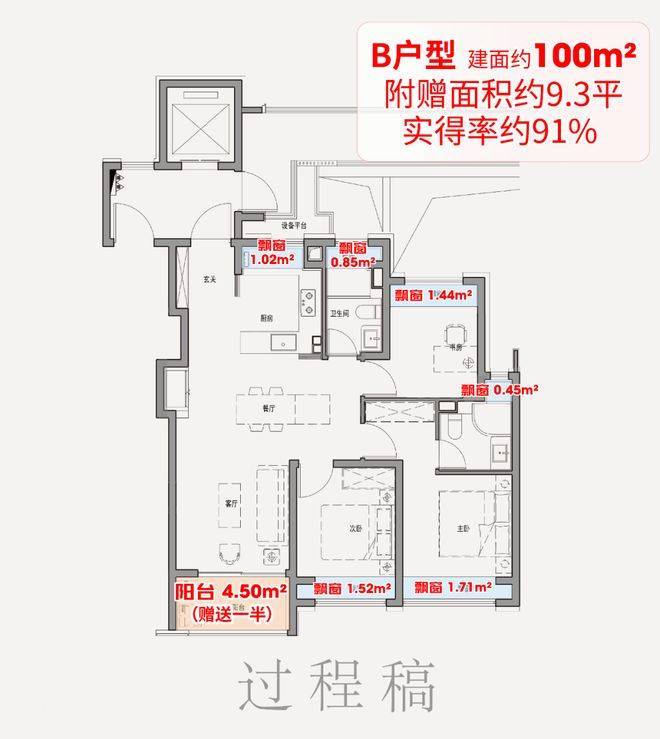 该户型满配6飘窗,比常规户型多2个卫生间飘窗、1个厨房飘窗;再加上阳台送一半面积,经过测算总赠送约9.3平,相当于一间次卧。