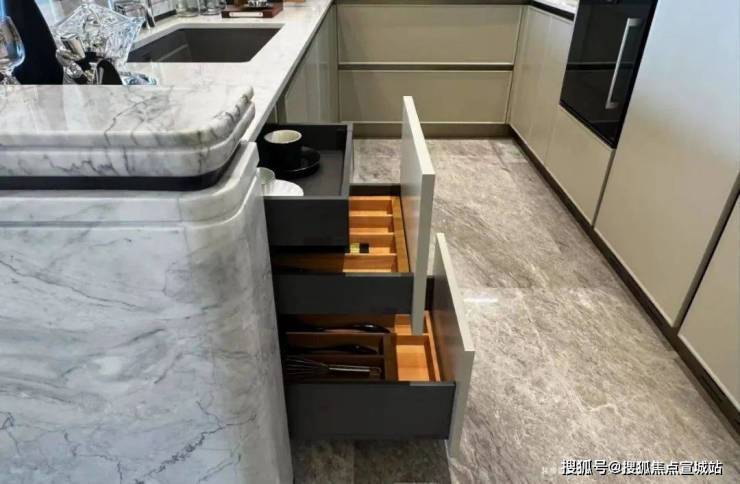 为使厨房成为「真正幸福之地」,璞元在各个细微之处倾注关怀,从地柜拉篮系统,到上柜系统,再到抽屉分格系统,浅抽与深抽搭配,让整个厨房空间,既百变,又充满秩序。