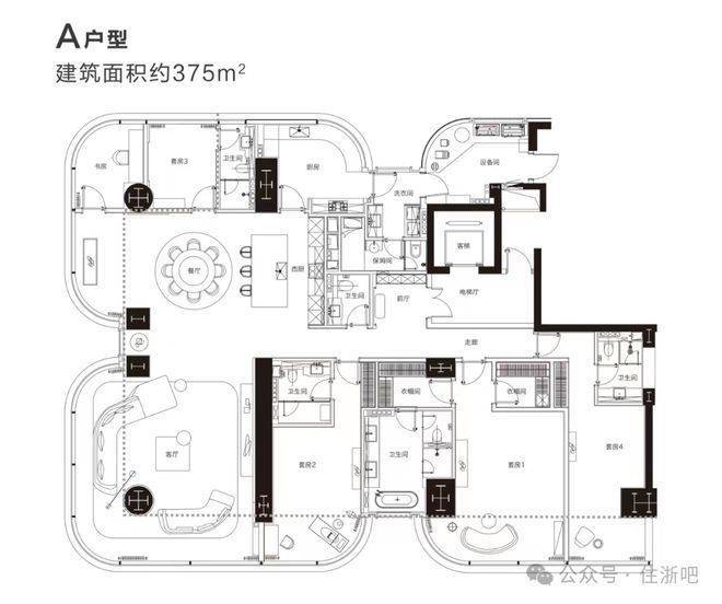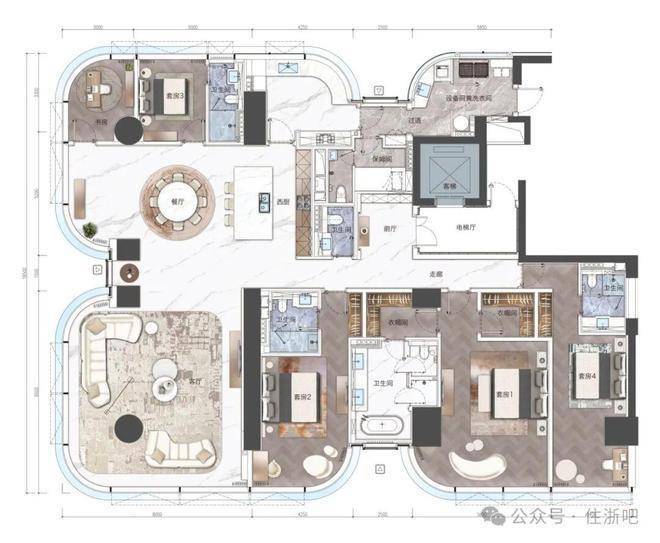 奢享空间:3.8米层高,200㎡L型大尺度会客厅,超大岛台,全套房设计,两厅独立,中西双厨……