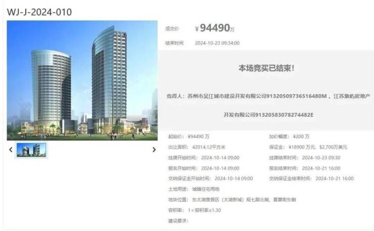 时间回溯至2024年10月,吴江城投与象屿地产以9.45亿元总价竞得太湖天誉地块,成交楼面价达17300元/㎡。这块位于吴江东太湖度假区规七路北、秋枫街西的 42014㎡ 珍贵土地,从诞生之初就注定不凡。