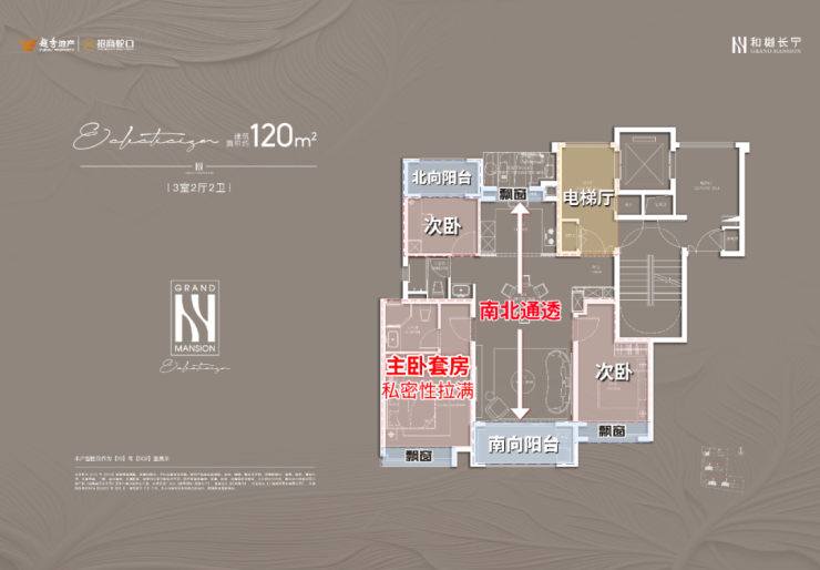 项目建面约120㎡户型也是类独立电梯厅的设计,室内则是标准的南北通透+三开间朝南设计;主卧套房配置,自带卫生间,私密性和舒适度俱佳。
