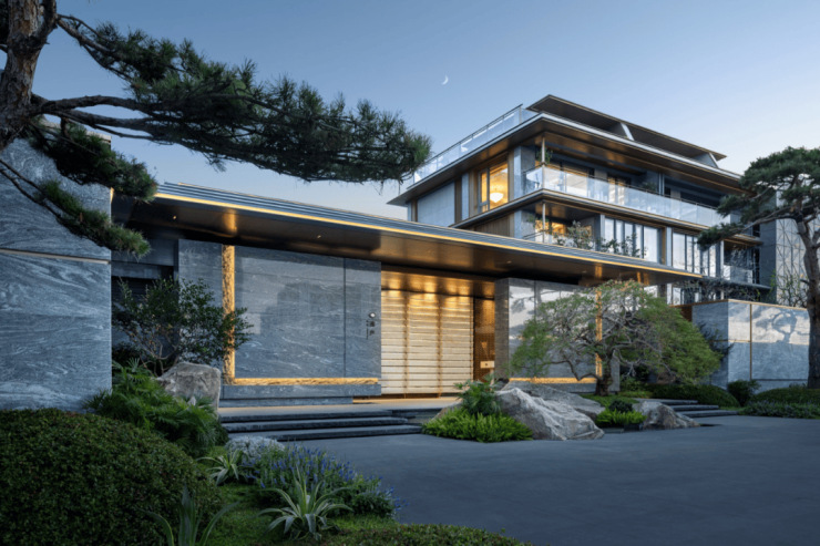从小区南侧的次入口进入,最吸引人的就是由75片珍贵的玉石拼接的玉石照壁,温润玉石与冷调金属相衬,光线流转间,含蓄托出中国人最喜爱的“金玉满堂”寓意。