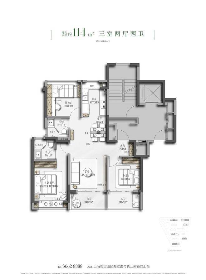 1、光感户型:约114㎡户型双阳台面宽超6米