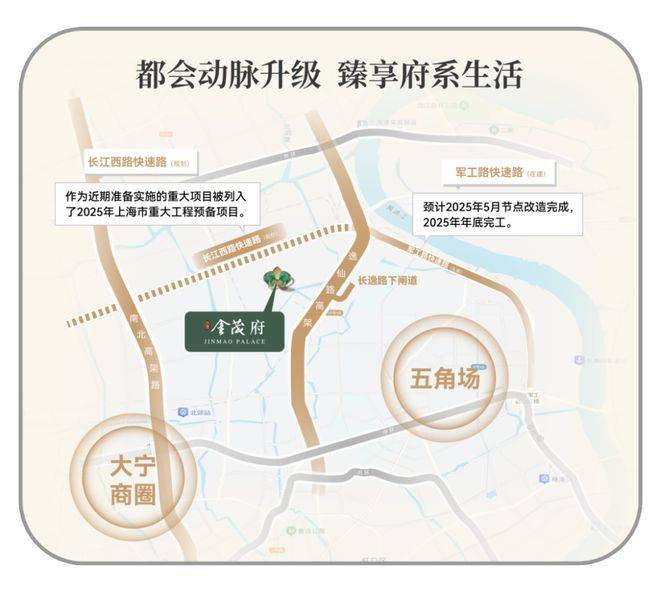 另一方面,军工路快速路新建工程预计今年年内完工(来源:上海发布),意味中环北抬今年将迈出重要一步,第二步长江西路快速路已被列入2025年上海市重大工程清单,预计即将开工——届时,江湾金茂府就将从“中环旁”升级为“中环内”!