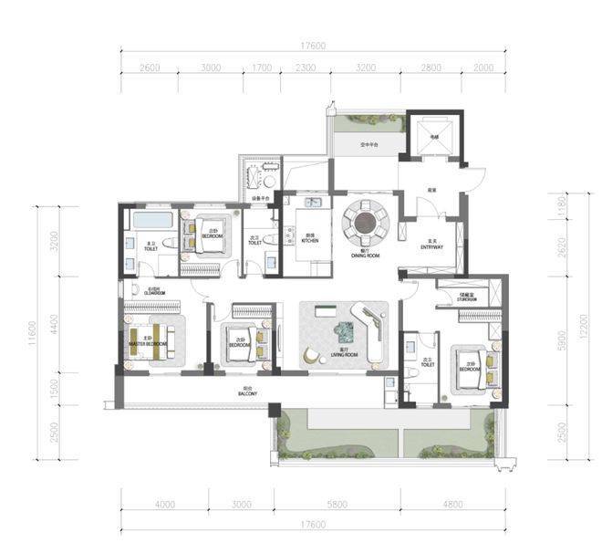 户户空中花园:大平层建面约160-185㎡,一梯一户,以185㎡为例,南向立体庭院开敞10+米,阳台面宽约12米,算上不计面积的部分,得房率惊人。更是将客餐厅、厨房、阳台、花园融合为连续空间,增添生活意趣。