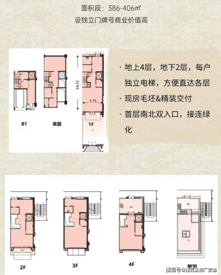 标准户型:地上4层(1~4层)、地下2层(夹层、B1层),多层商业空间,可灵活设计;外设独立门牌,内设独立电梯★,B1层可直达地下车库;首层设南北双门,连接绿化*;预设太阳能热水系统★。