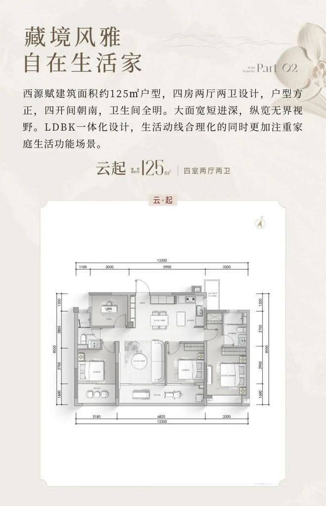 125㎡ 4室2厅2卫(中间套)四开间朝南设计,南向面宽拉满,采光通风效果俱佳;LDKB空间一体化布局,灵活适配二孩家庭日常居住需求;主卧套房设计,配备独立卫浴与专属衣橱,私密性十足;封闭式阳台可灵活改造,进一步提升空间利用率!