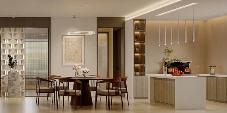 餐厅与客厅无缝衔接,延续整体极简调性,却藏着专属的烟火仪式感。设计以“适配家庭用餐、兼顾亲友相聚”为核心,将实用性与美学感完美融合,让每一顿三餐都成为生活的小确幸。厨房采用U型+岛台布局,贴合日常烹饪动线,整体搭配木色柜门,与空间整体极简调性呼应,兼顾实用与颜值,让烹饪时光更具舒适感。