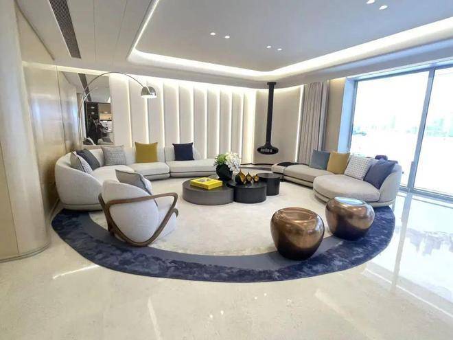 客厅空间采用大量造价昂贵的弧面设计,带来更有格调的审美价值: