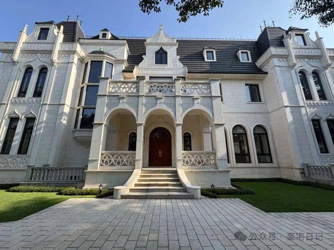 浅米白石材立面,搭配深灰坡屋顶,经典的老虎窗与雕花栏杆,复刻着法国贵族的仪式感。