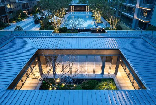 尚云赋的南侧主入口,重檐门庭、金属格栅、意趣昆石,搭配约70万珍稀古树,还原宋画中深宅大院的威仪。