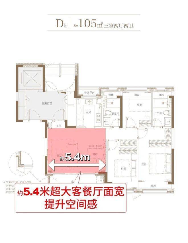 我们重点来看主力的建面约105㎡3房2卫户型: