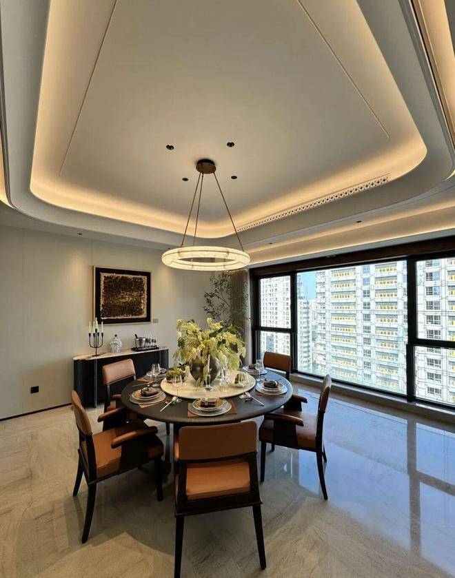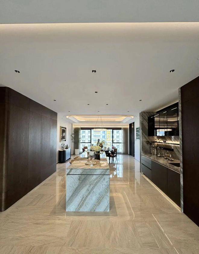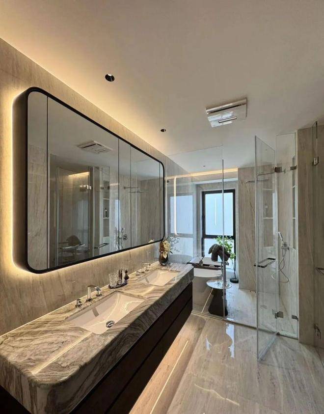 硬装:葡萄牙米黄石材 + 古铜金属线条,全屋大理石