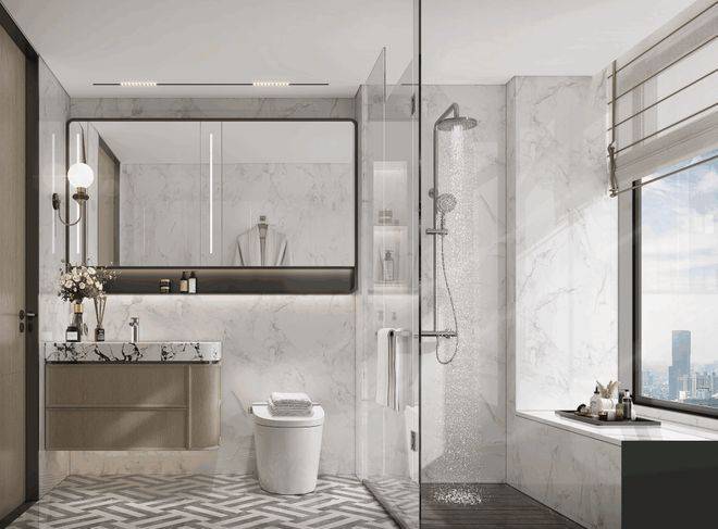 卫生间的收纳更是创新!双卫配置大容量镜柜并增设置物台提升实用性;公卫通体收纳柜,细枝末节的杂物均可一并容纳!
