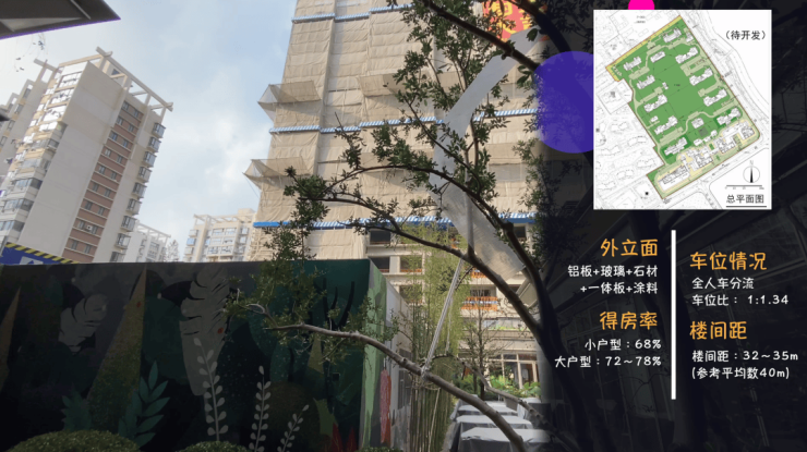此外,就是小区的一些基本参数。相比之前小户型68%的得房率,本次大户型的得房率主要在72-78%之间,小区全人车分流,车位比1:1.34。