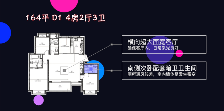 D1为4房的中间套户型,户型上,除了南向次卧有个暗卫外,几乎没有其它缺点。