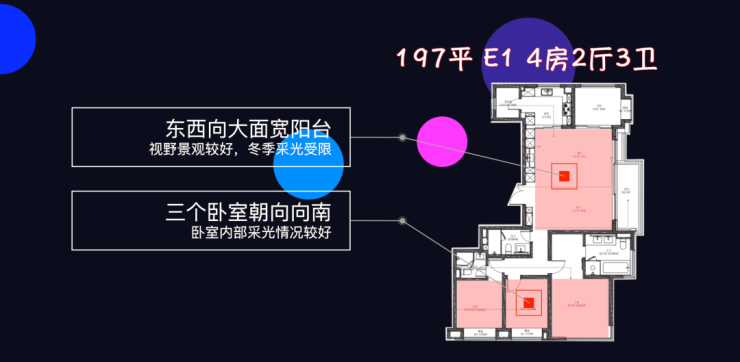 197平的边套4房户型。超宽的客厅,未来可以说是景观无敌。