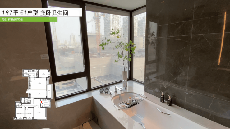 另外,这个大落地窗搭配32米的楼间距,这里的住户享受都市阳光的同时也存在私密性的问题吧。来到卫生间,也能看到浴缸这里,仁恒样板房已经为你贴心的装好了窗帘。