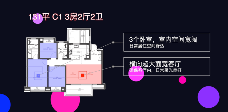 其中C1为131平的边套的3房户型,大横厅外加动静结合的布局设计,几乎找不到嘈点。