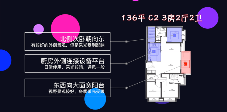 C2为136平的3房的边套户型,厨房连接的设备平台外加东西朝向的连厅阳台,未来可能存在采光影响。北侧的次卧受小区景观需要,东西向的窗户朝向总感觉不是很好。