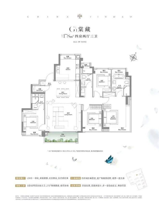 建面约117㎡3房2厅2卫,做到了3+1开间朝南5个飘窗+主卧套房设计+270°转角飘窗,所有的尺度都有进一步提升。