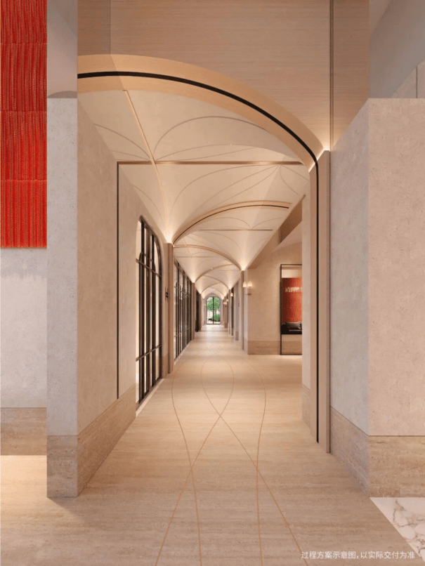 全系风雨连廊。项目打造了上海市场罕见的“流线全覆盖”连廊系统。这条连廊不仅是遮风避雨的通道,其下方空间更被打造为一座与花园景观交融的“线性美术馆”。让业主归家成为穿梭时空的艺术之旅。