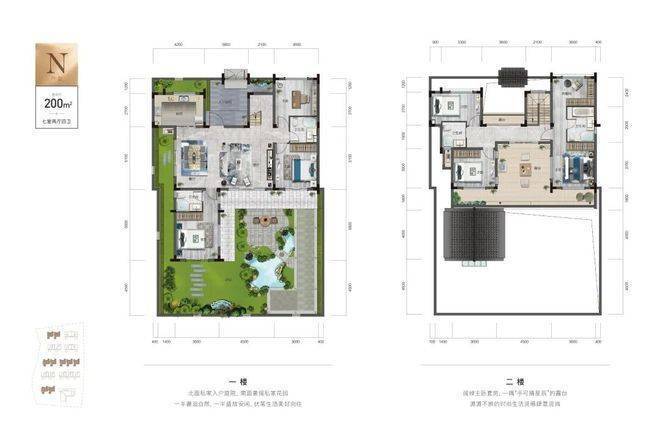 合院:建面约200㎡七居室,总价约760万,带120-190㎡私属庭院及5.9米挑高地下室。