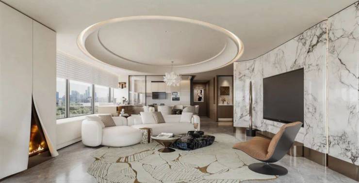 全屋摒弃方正硬朗的空间棱角,顶面用环形悬浮圆弧吊顶与内嵌灯带,弧形曲面包覆从顶面延伸至墙面,弱化建筑原生边界,拉伸空间纵深感,使客厅有温柔舒展的气场。