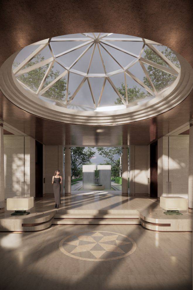 通过极具仪式感的归家门头,复杂的肌理铜板吊顶、宝格绿奢石门套与定制化蚀刻纹样,通过视觉、触觉的不同感官感受,完成了归家的身份转换。