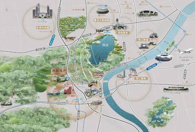 项目周边有浙江省博物馆新馆、浙江图书馆新馆、浙江省非物质文化遗产馆、浙江省文学馆等“四大馆”,和中国美院、浙江音乐学院、浙大之江校区、钱塘大学(在建)等“四大校”。
