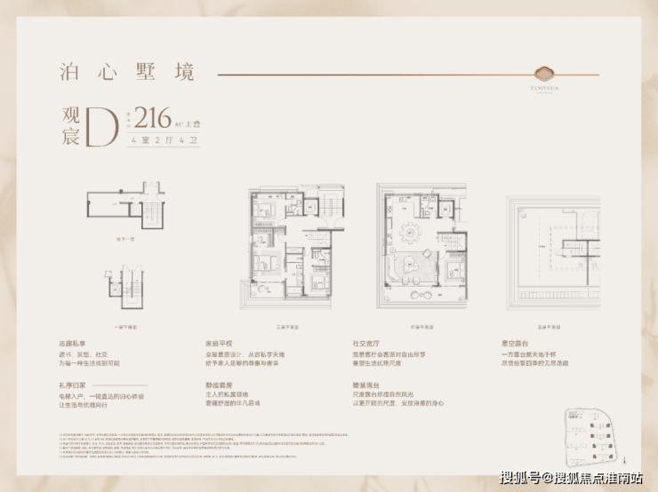 叠加别墅有个“垂直动静分离”设计。上叠三层设置三个全套房卧室,客餐厅布置在视野更好的四层,直接解决了叠加别墅上下邻居可能会有的隔音问题。