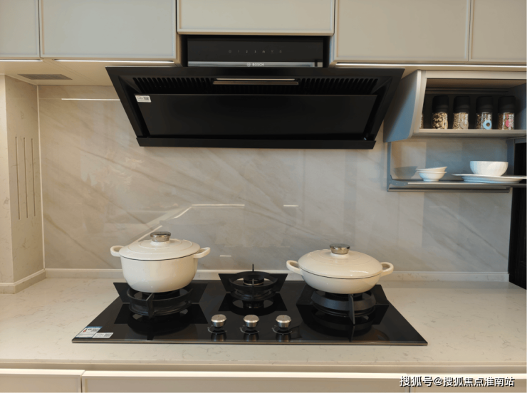 装修标准也值得特别提一下,「绿城逸庐」高层户型厨房选用的博世三眼燃气灶、油烟机、蒸烤一体机、15件套洗碗机+嘉格纳冰箱组合就显得很有生活洞察力,平衡了耐用性与体验感。