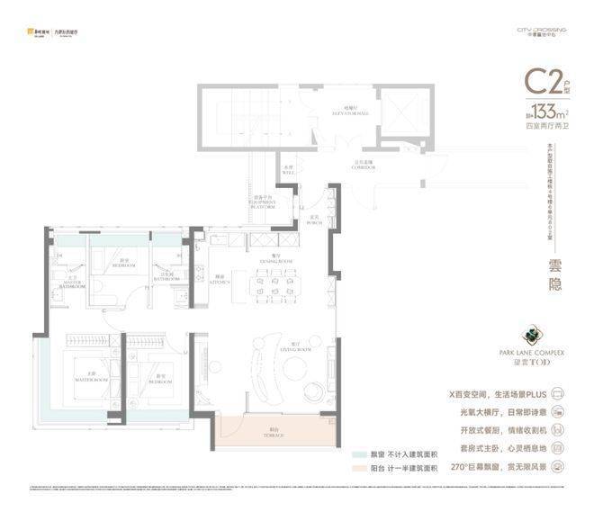 133㎡可以说是108㎡的进阶款,同样的三房两厅两卫,大面宽横厅、半开放式厨房设置岛台,加上主卧L型飘窗,再一次验证了华润置地豪宅化的产品思路。