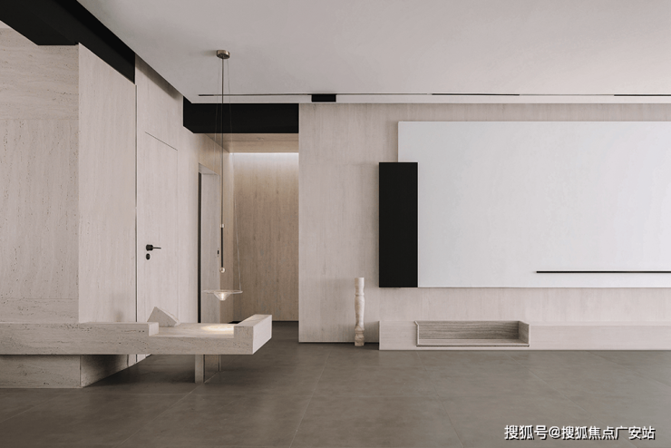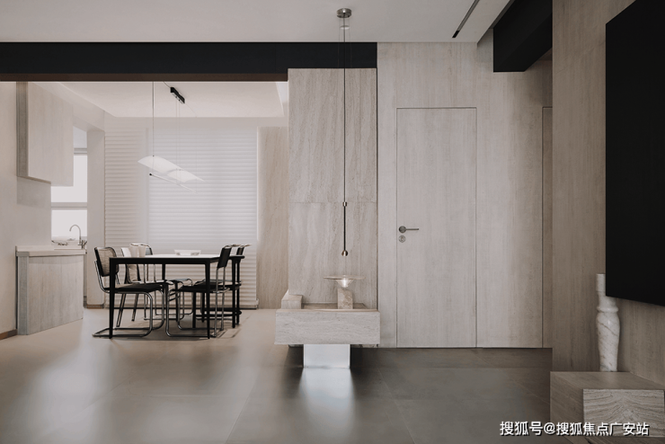 从门厅到餐厅形成两个错落有致的方形结构,顶面的横梁与墙体的凹凸下陷相互呼应,丰富多变的空间层次及肌理运用,成为了划分功能和区块的空间骨骼。