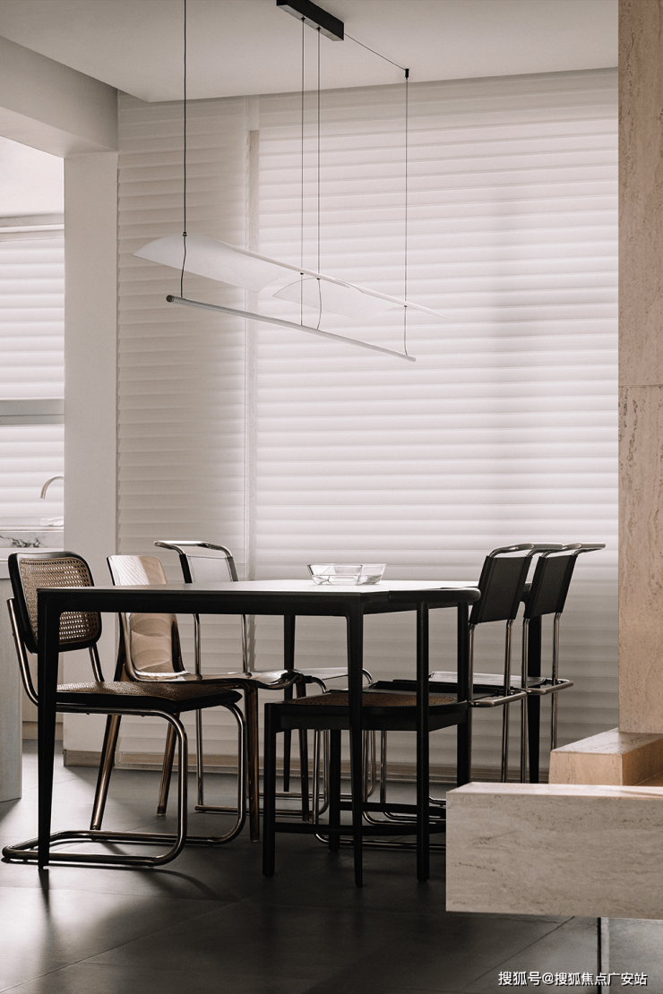 在公共空间的处理上,为了更好地利用窗景与采光的同时还能够获得更加通透的空间效果,将原有的入户门厅与隔间拆除,让西厨与餐厅拥有更加宽敞的使用空间,营造相对舒适的就餐氛围。