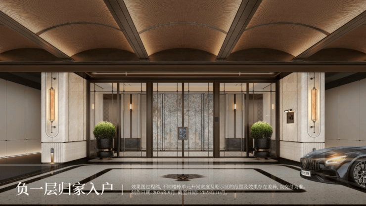 熠熠生辉的玉兰门庭掩映下,飞翼祥纹铜雕府门镶嵌非遗掐丝珐琅门钹,环抱式落客前场移步易景,敬候尊崇归家。