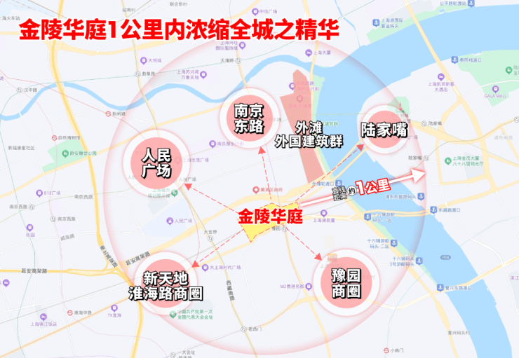 作为上海绝对市心,金陵华庭1公里生活圈囊括人民广场、淮海路、新天地、外滩、豫园、陆家嘴等上海市地标性区域。