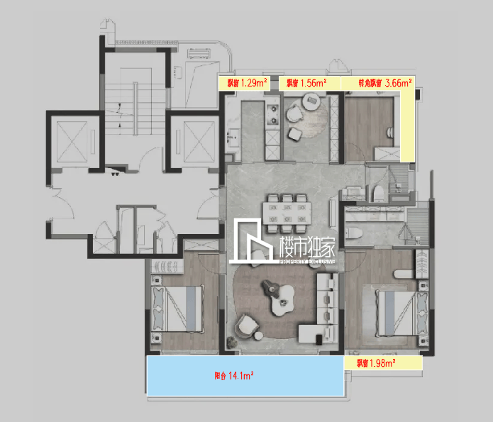 此外,实得率是这个户型的一大亮点,通过专业建筑测评发现,套内面积大约在127.56㎡,实得率约89.2%!