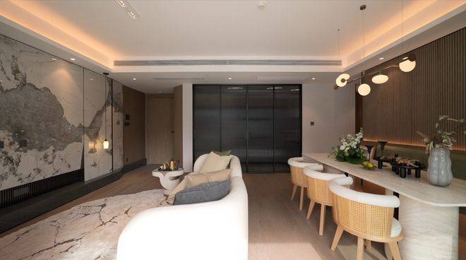 材质强调纯粹性,以羊毛混纺织物、罗马洞石大理石、原木、陶器、黄铜等材料为主,纹理和形状之间达到微妙平衡,简洁中透露生活的温度。