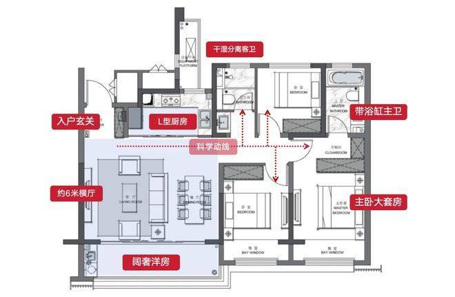 开放式的厨房、独立的餐厅、独立的玄关、带独立浴缸的主卫,以及主卧270°视野的飘窗,无一不是对生活颗粒度的精致打磨。
