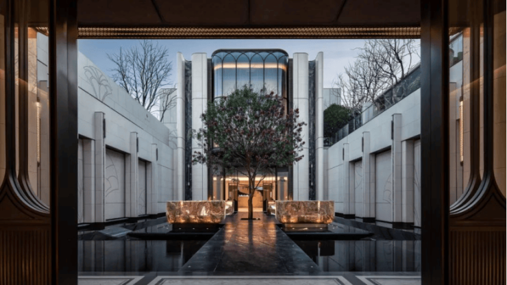 不仅是金钱上的奢侈,更是时间广度的奢侈。比如,整个下沉式庭院材料选用土耳其进口老虎玉,由匠人耗时60天手工打磨定制,可见海上·清和玺对业主归家仪式感设计的用心与苛求。海派光厅之外的归家迎宾树木更是由设计师辗转多个城市才寻到的、树龄超60年的福木“紫薇”。