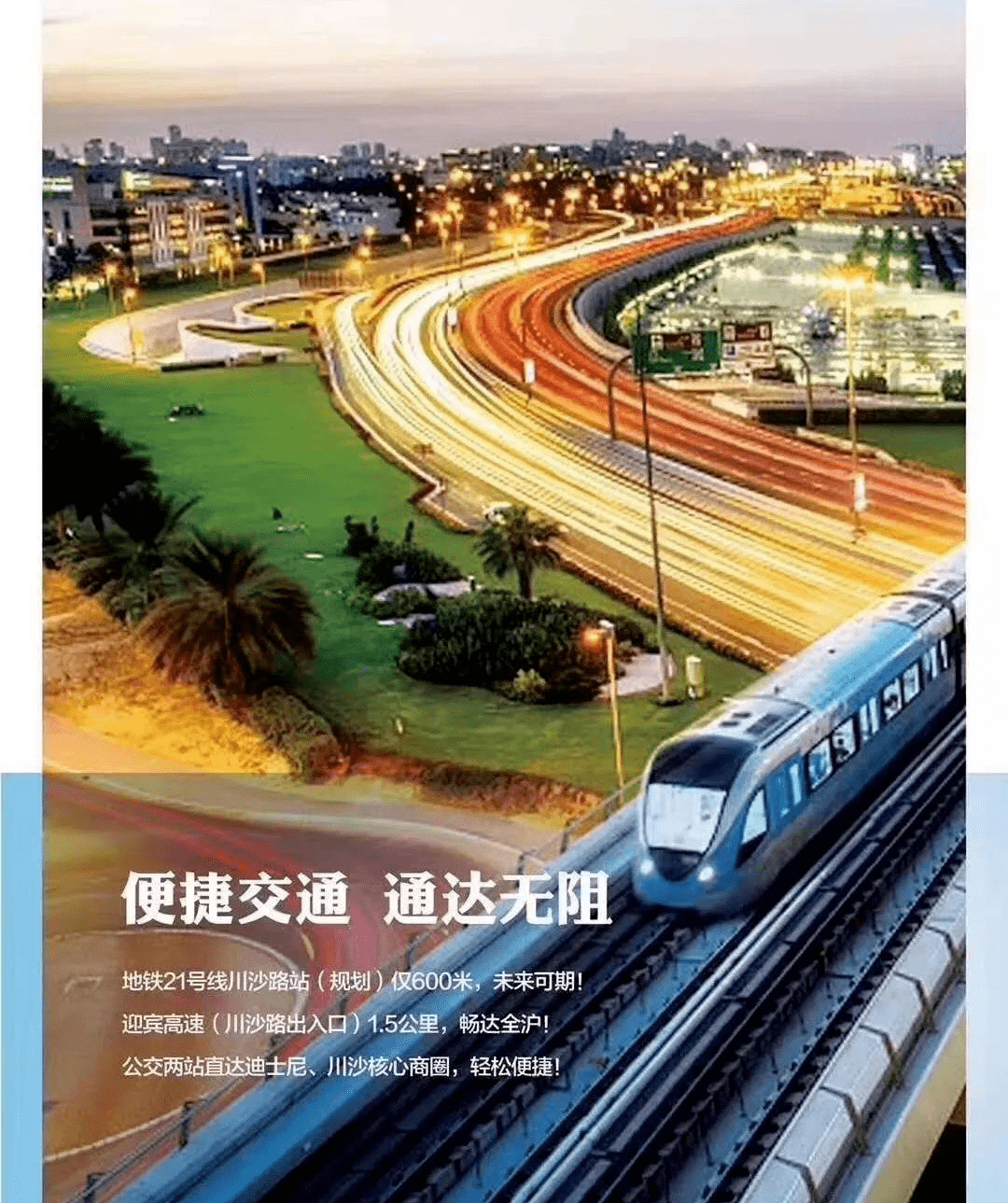 项目交通方面:据迪士尼仅10分钟车程,距地铁2号线1.8公里5分钟车程,项目门口就是公交站。