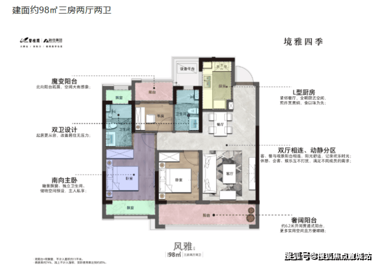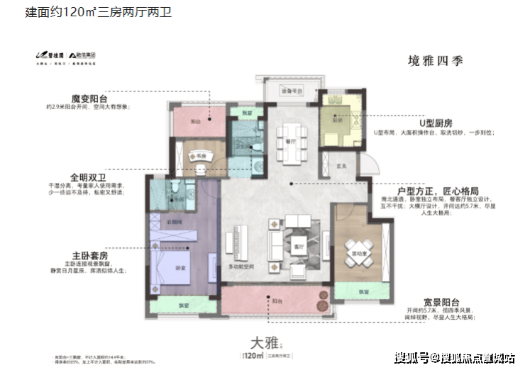 主力户型:建面约 98 - 130㎡的户型,涵盖 98㎡三房两厅两卫、120㎡三房两厅两卫以及 130㎡四房两厅两卫。其中 98㎡高层户型为一梯两户设计,搭配南北双阳台,卧室全朝南且南北通透;120 - 130㎡洋房户型为两梯四户,采用主卧套房设计,120㎡户型的客厅开间达 5.7 米。