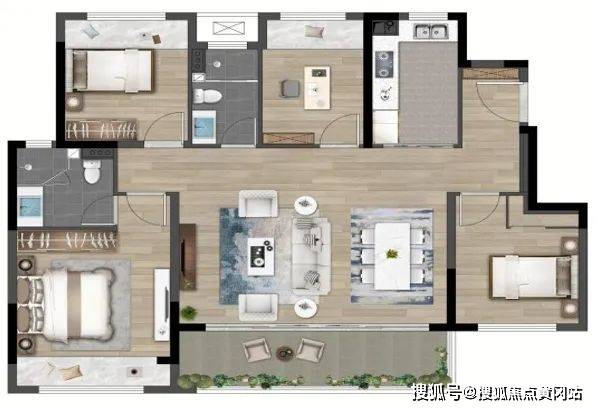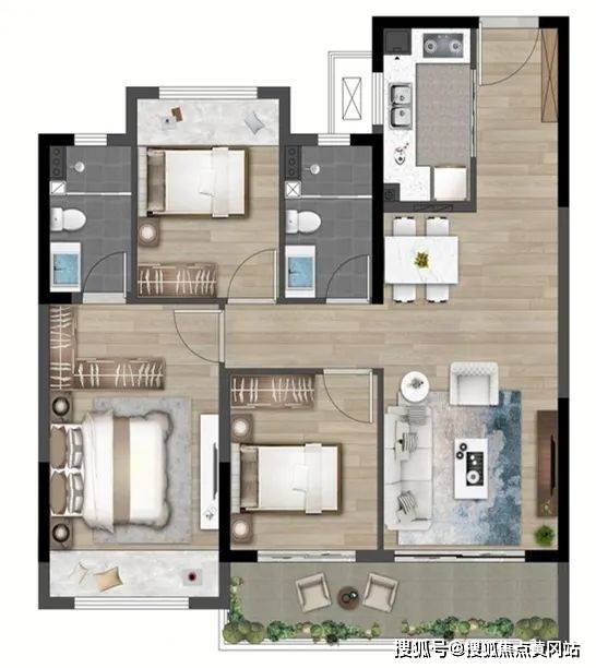 高层在售建面97平方3房2厅2卫,2梯4户设计,得房率约82%!(高层得房率通常为75%左右)。