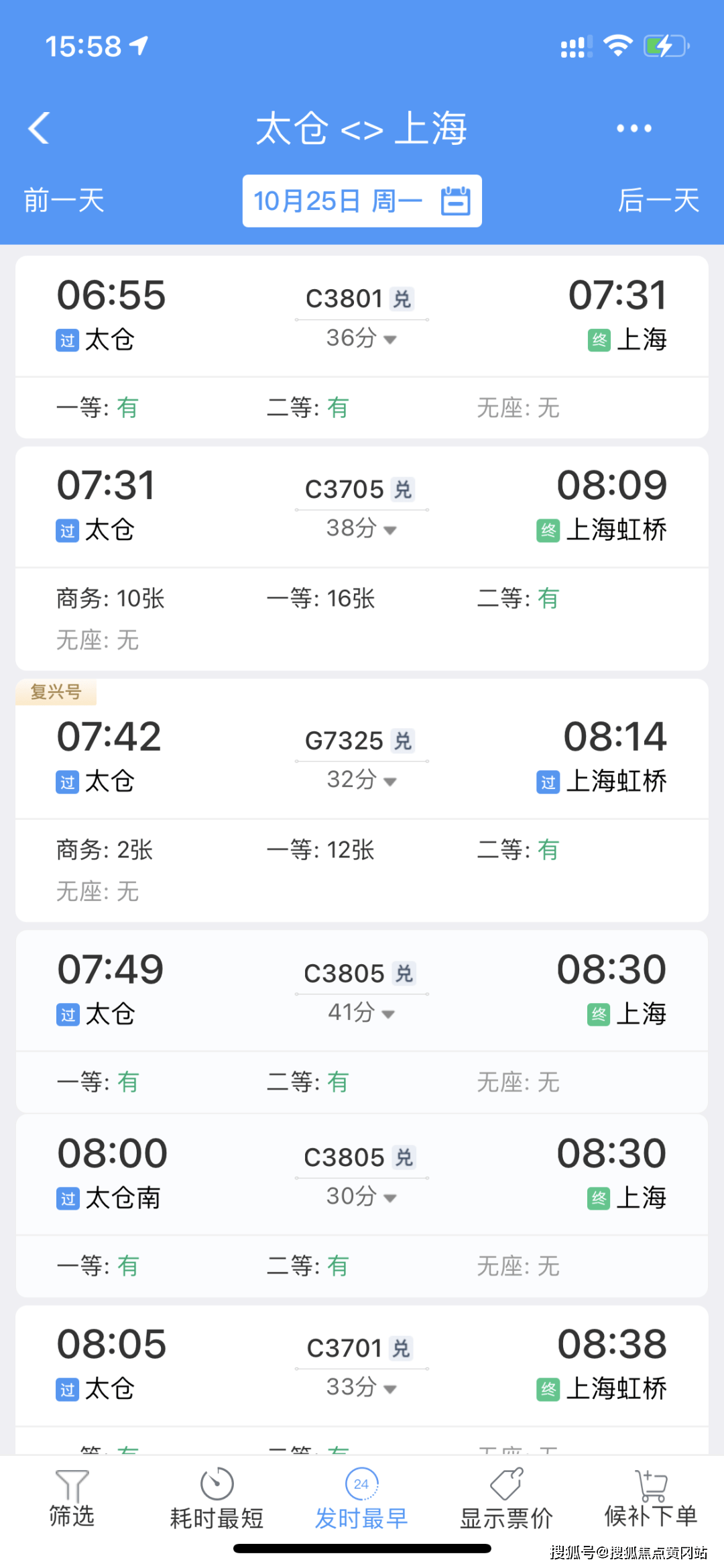 太仓站→上海时刻表(来源:12306)