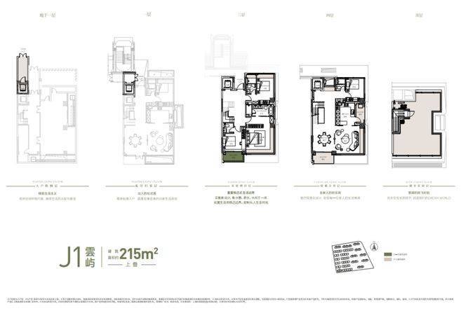 建面约215㎡上叠:屋面+庭院+地下室+露台+阳台的整体附赠空间约110㎡;