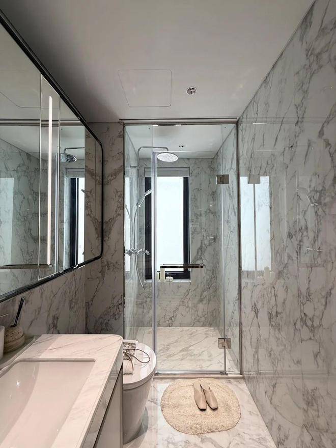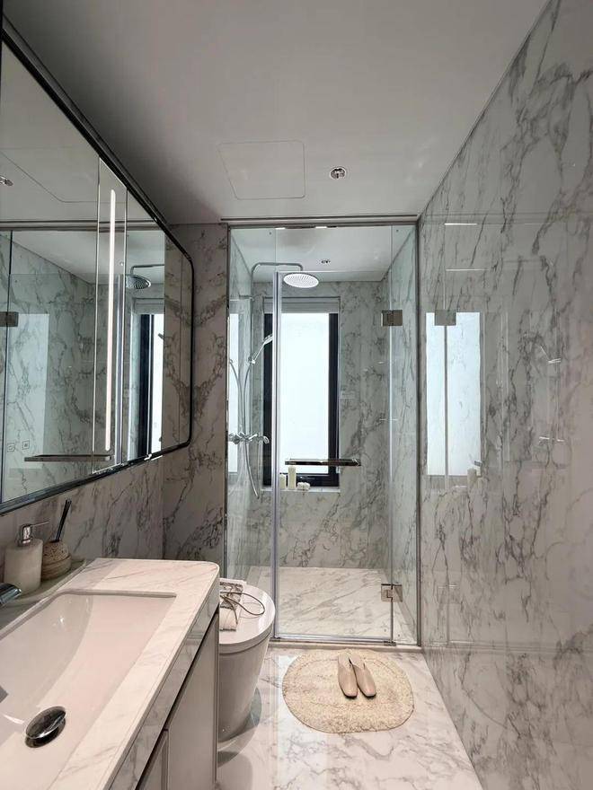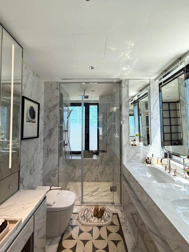 收纳细节上,二期户型中完美继承了一期的收纳系统,玄关收纳,整面内嵌柜体一直延伸到餐边柜;厨房全屋定制的柜体;卫浴的镜面柜和美妆冰箱等等,主卧卫生间的进一步升级:洗手台与化妆台相对,拥有三面镜柜,视觉空间进一步扩展和延伸。
